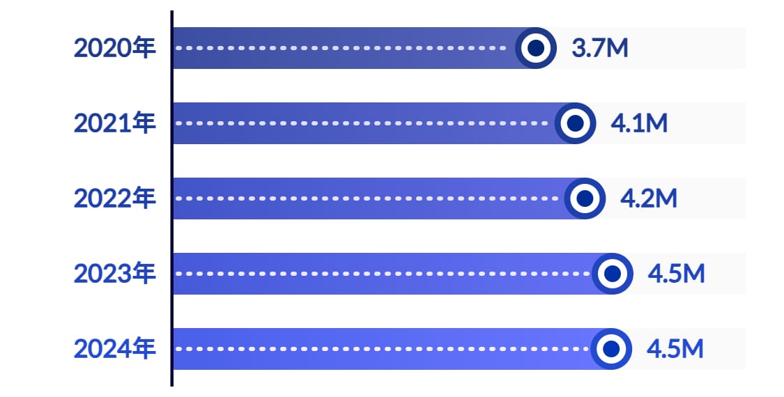 2020年の年間受験者数が約370万人だったのが、2021年にはついに400万人を超えます。以降も年間で400万人以上の受験者数を維持して上昇を続けていることが分かります。